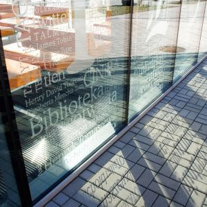 Wnętrza są rozświetlane przez 4 tysiące okien o wyprofilowanym kształcie. Każde z okien ma 18 centymetrów szerokości. Wysokość zmienia się w ten sposób, że okna stają się niższe im wyżej są położone. Elewację biblioteki można najbardziej podziwiać wieczorem, kiedy w budynku są zapalone światła.