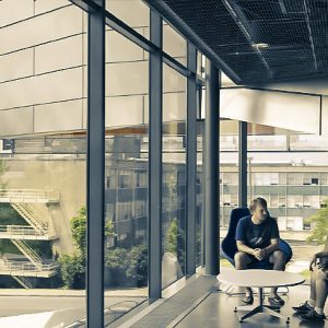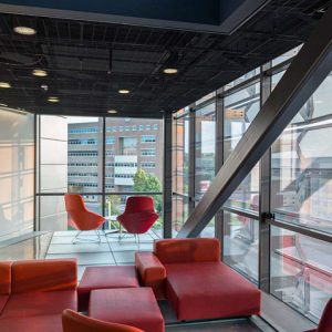 W konstrukcji budynku dominują duże przeszklenia. Zarówno wewnątrz, jak i na zewnątrz. Z zewnątrz system całkowicie szklanych ścian znajduje się na pierwszym i piątym piętrze. Elewacja pozostałym pięter stworzona jest z pasma perforowanych paneli ze stali nierdzewnej. Panele są ustawione pod różnymi kątami w poprzek elewacji, w zależności od orientacjii słonecznej. Zastosowanie zewnętrznych ścian przeszklonych ma na celu zmaksymalizowanie ilości dziennego światła docierające do wewnątrz budynku.